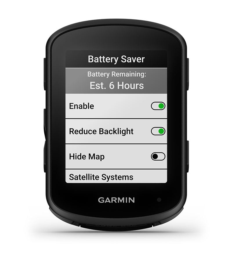 The Edge 840 cycling computer gets up to 26 hours of battery life in intense mode and up to 42 hours using battery saver mode.
