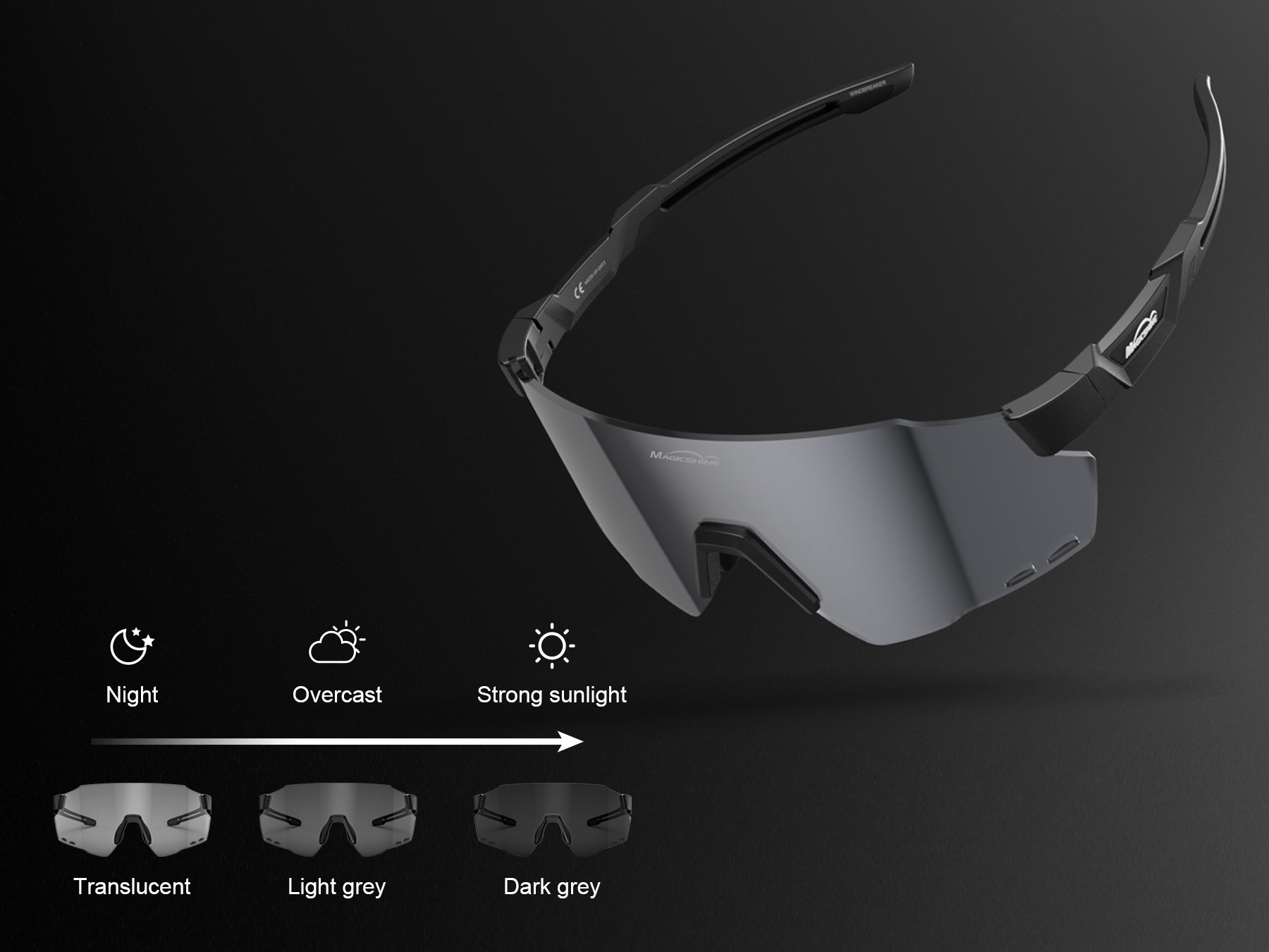 WINDBREAKER PHOTOCHROMIC CYCLING SUNGLASSES adopt photochromic lenses that the lens tint can change with the light condition from cat.1 to cat.3, effectively preventing your eyes from strong sunlight, UV rays, and glare light, plus support all-weather use.